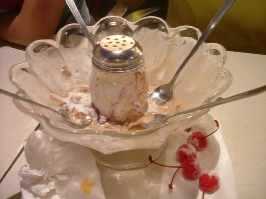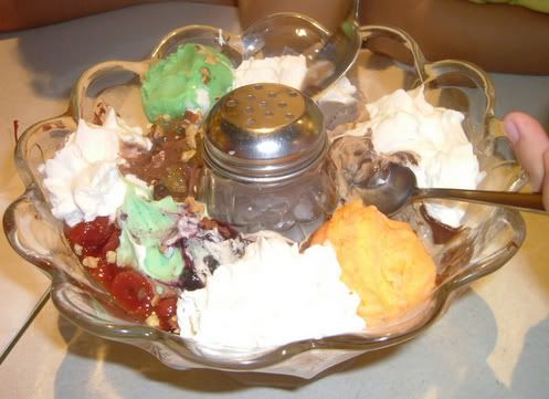 poor ps have to wait 4 her 4 so long… cos her breaded chicken came so early…. But the time she’s abt to finished her chicken, our baked rice jus came…. Finalli we got to eat our long awaited earthquake… I cant remember the ice-cream flavours… look at the pic below n try to guess the flavours urself…